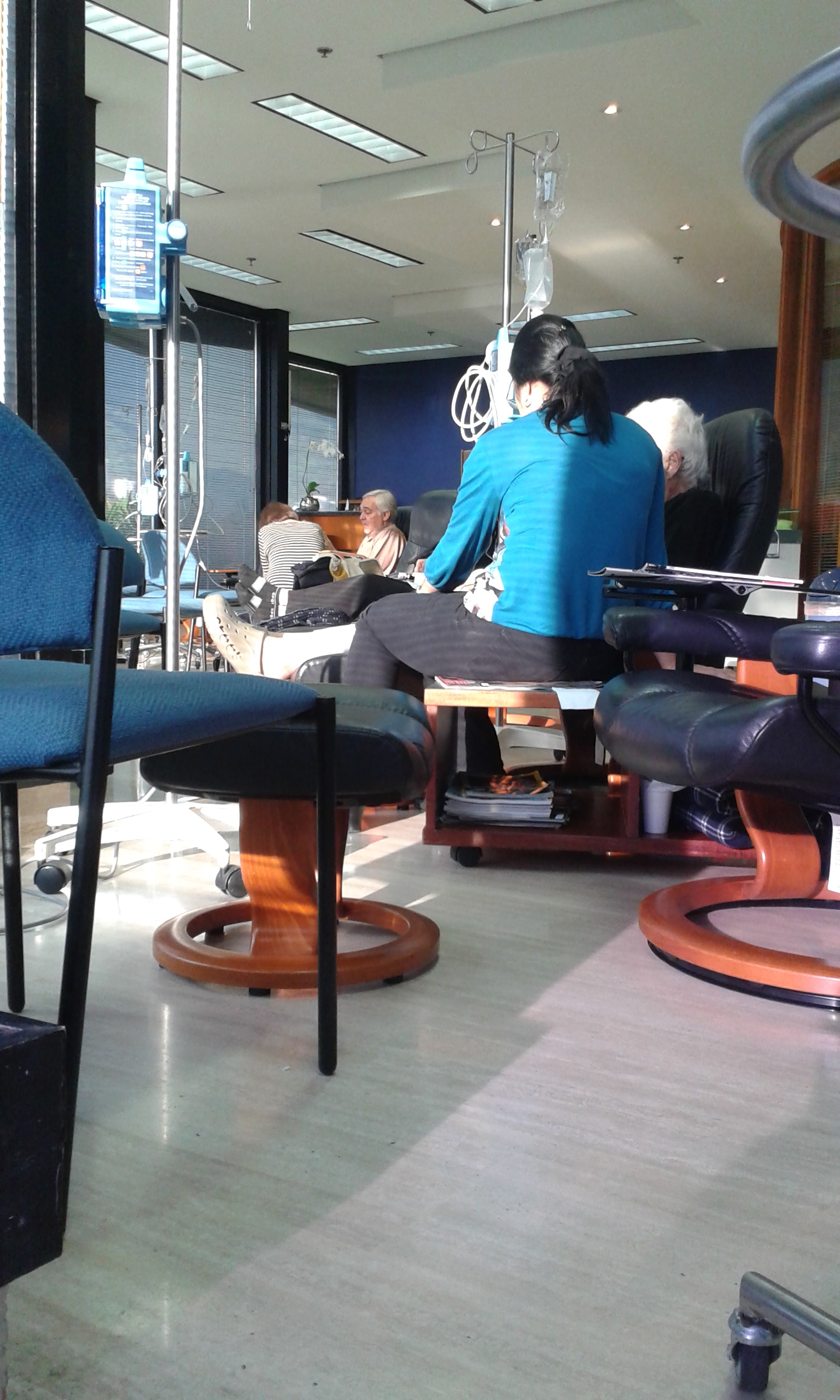 A partir de la segunda terapia me convertí en la acompañante de mi hermana, ya que en el trabajo me otorgaron un permiso especial para asistir a las quimioterapias. La primera vez que entré a la sala de tratamiento me impresioné de lo bonita que era, un salón elegante, con una gran entrada de luz natural y con una increíble vista al Ávila, en esta sala se atiende un promedio de 12 pacientes entre cómodos sillones y cubículos, siendo estos últimos los disponibles para los casos más especiales, mientras en otra salita más pequeña, que puede considerarse de «espera», atienden a pacientes con la intención de ganar tiempo.