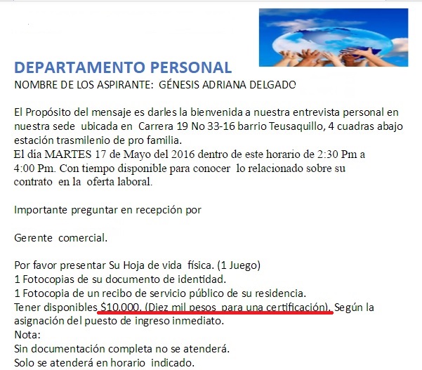 Después me llegó otro correo, similar pero un poco más elegante, me citaron a la entrevista y me pidieron que asistiera con traje formal, bien peinada y maquillada. Al leer esto me sentí la mayor ejecutiva de los indocumentados venezolanos, pero pues, resultó que tenía que vestir elegante porque «el arancel» que debía pagar para empezar a trabajar, era más alto: 30 mil pesos, y el pago, además, no te daba la seguridad del empleo.