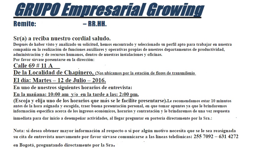 Las direcciones de las citas para las entrevistas suelen ser hacia el Chapinero, centro y sur de la ciudad, en edificios pequeños y sin identificar, esto lo notas porque al darte la ubicación te dan un punto de referencia muy nulo (como una farmacia o una estación de Transmilenio).