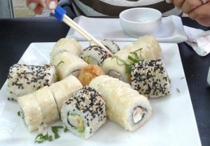 Cuando llegué a Chile, lo probé en una discoteca, que lo estaban dando como pasapalo y me pareció bien, luego lo probé en un Baby Shower, donde lo hizo una de las tías del bebé que iba a nacer y me pareció mejor, me los comí casi todos. Después de eso no hubo vuelta atrás, casi todos los locales de sushi de Santiago me tienen registrada como socia.